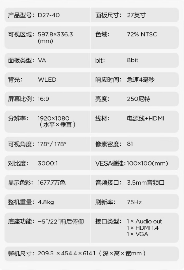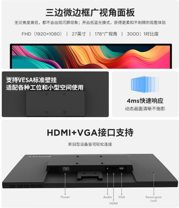 商品名稱:聯(lián)想(lenovo)D27-40 液晶顯示器 微邊框廣視角 低藍光不閃屏 可壁掛高清屏顯示器