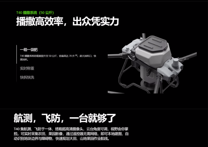 商品名稱:大疆(DJI)T40 無(wú)人機(jī) 50公斤播撒載重有源相控陣?yán)走_(dá)智圖雙目視覺感知植保機(jī)