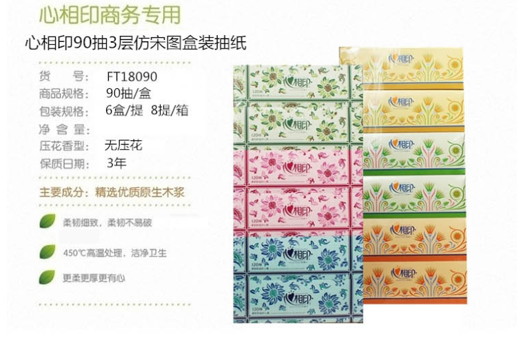 商品名稱:心相印抽紙FT18090 硬盒抽紙辦公商用紙巾面巾紙單盒3層抽紙90抽(6盒裝)抽紙FT18090